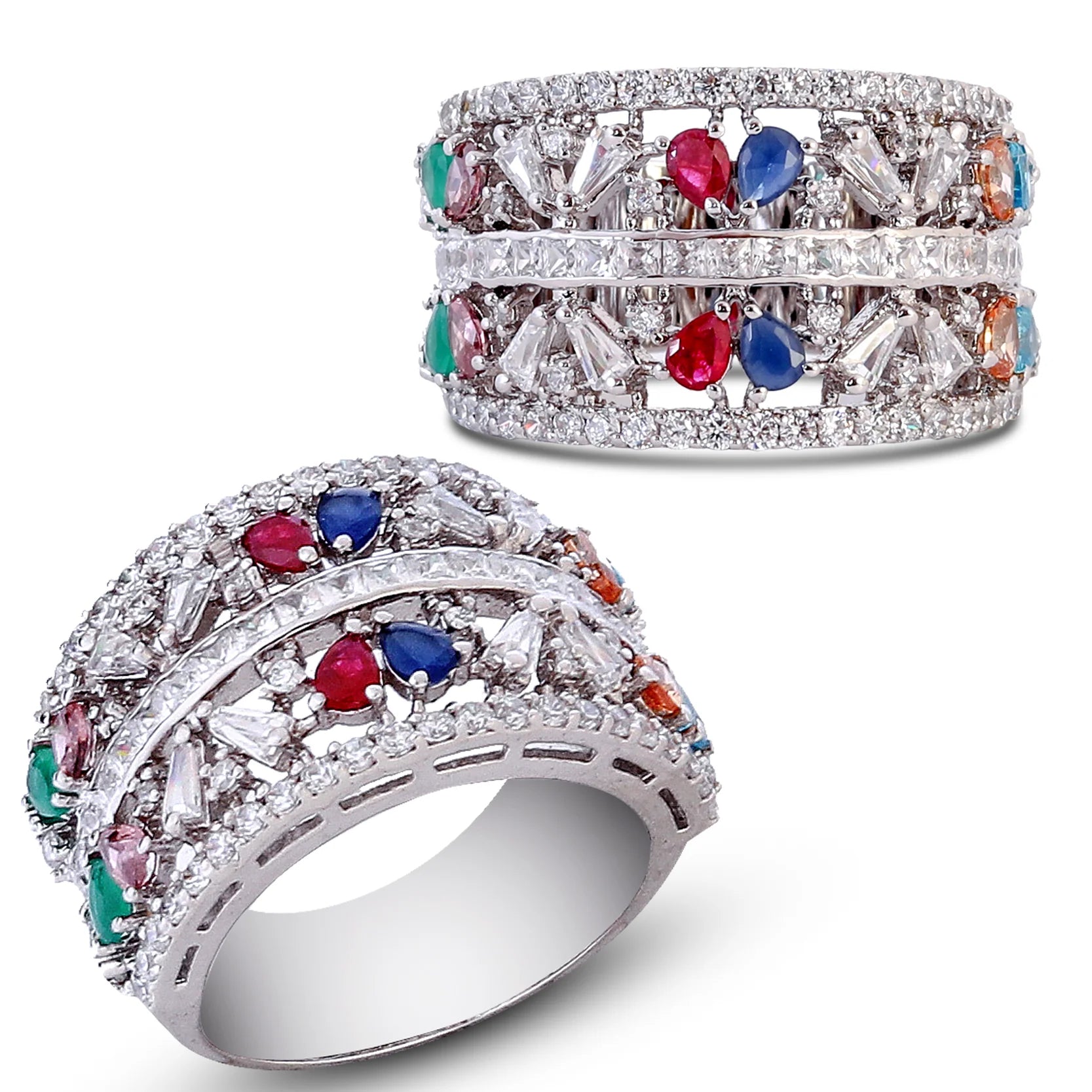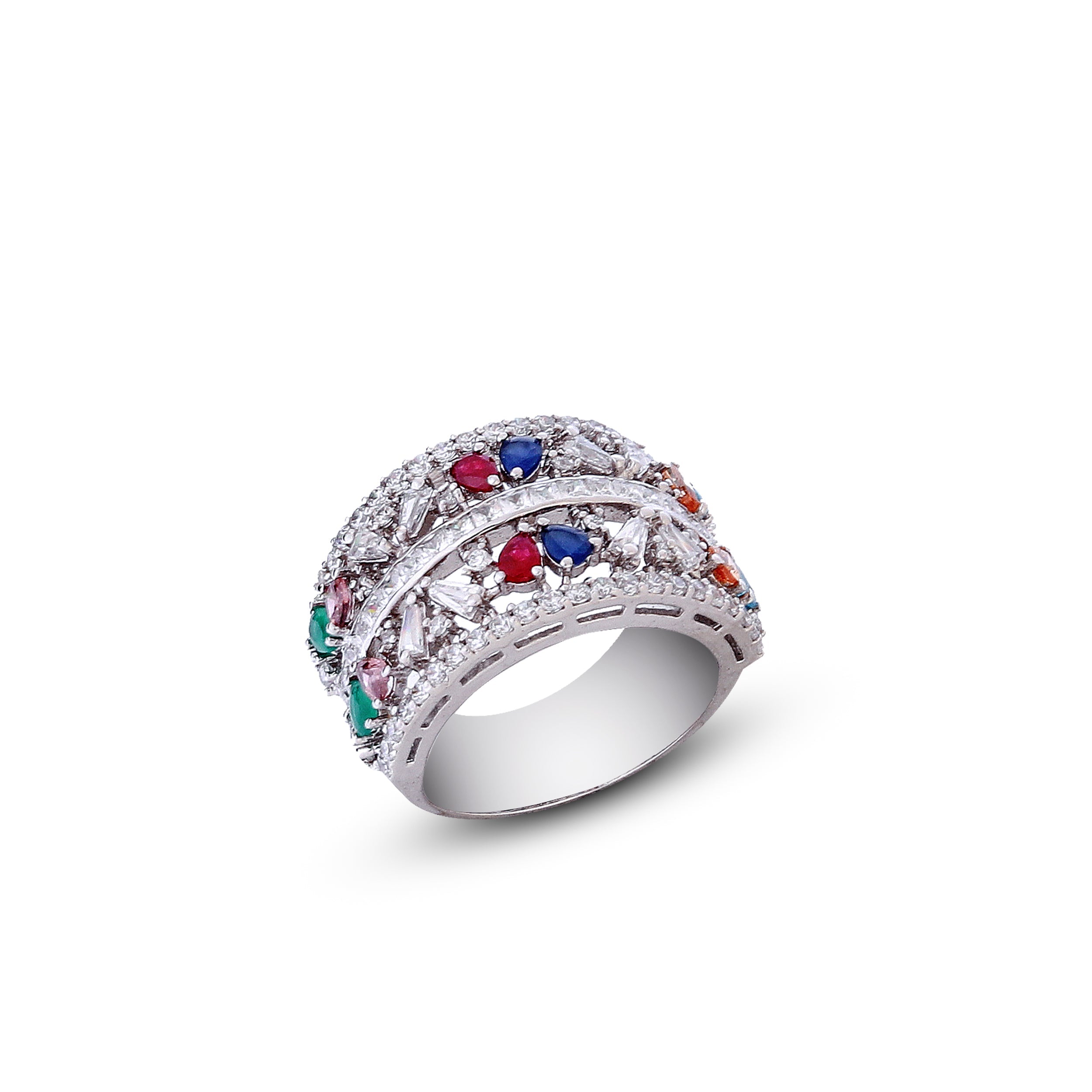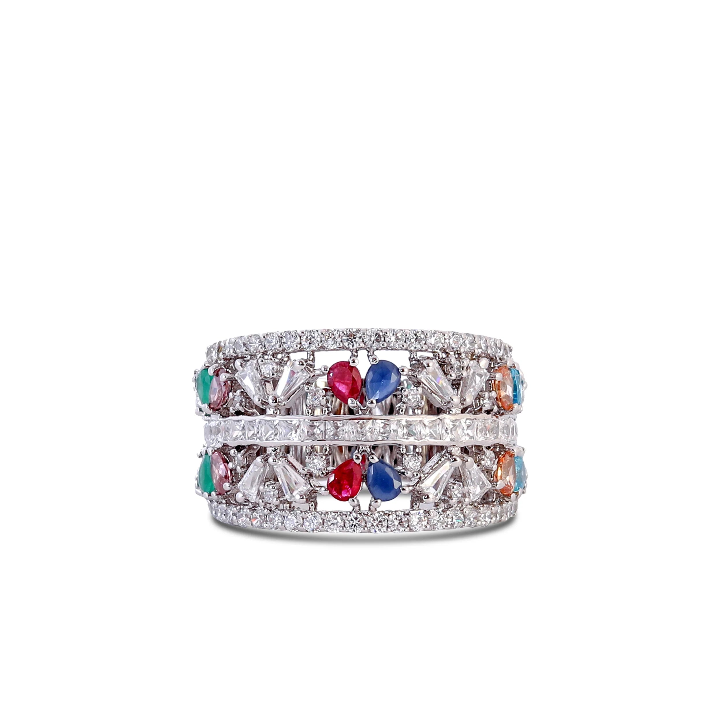 Make a bold fashion statement with our stunning Multicolor Gemstone Wide Band Ring, expertly crafted in premium 925 sterling silver. This eye-catching ring features an array of heart-shaped and baguette-cut stones in vivid hues – including ruby red, sapphire blue, emerald green, and citrine orange – beautifully set in a double-layered band. A dazzling arrangement of cubic zirconia adds brilliance and luxury to every angle.